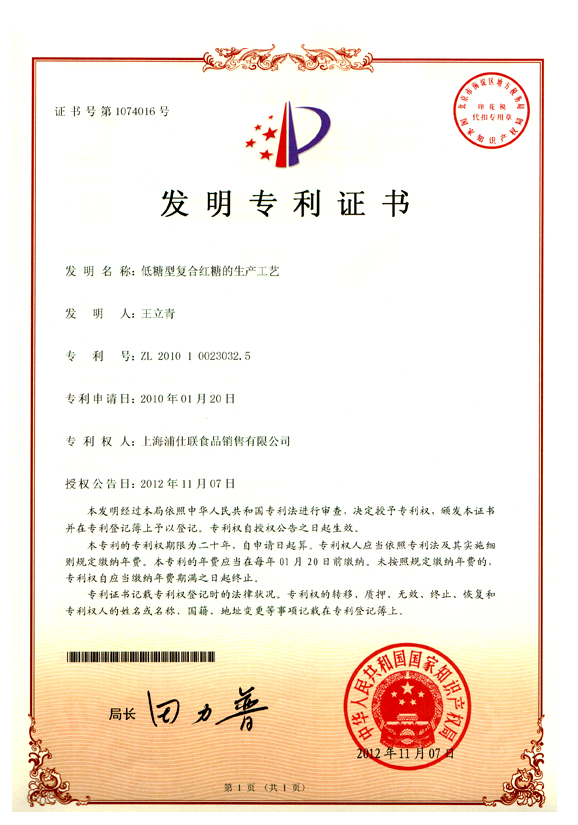 本公司發明申請的“低糖型復合紅糖的生產工藝”,最近被國家知識產權局授予專利權,并在近期頒發了發明專利證書,發明專利號為“ZL 2010 1 0023032.5”,這是浦仕聯公司在企業自主創新工作方面結出的又一碩果。